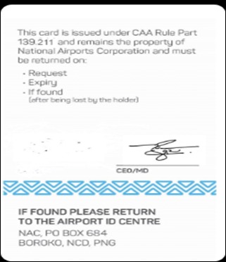 The National Aviation Security ID Centre may issue a PNG Red ASIC to a person in order to provide the holder access to Port Moresby International Airport and any Security Designated and gazetted airports in Papua New Guinea.