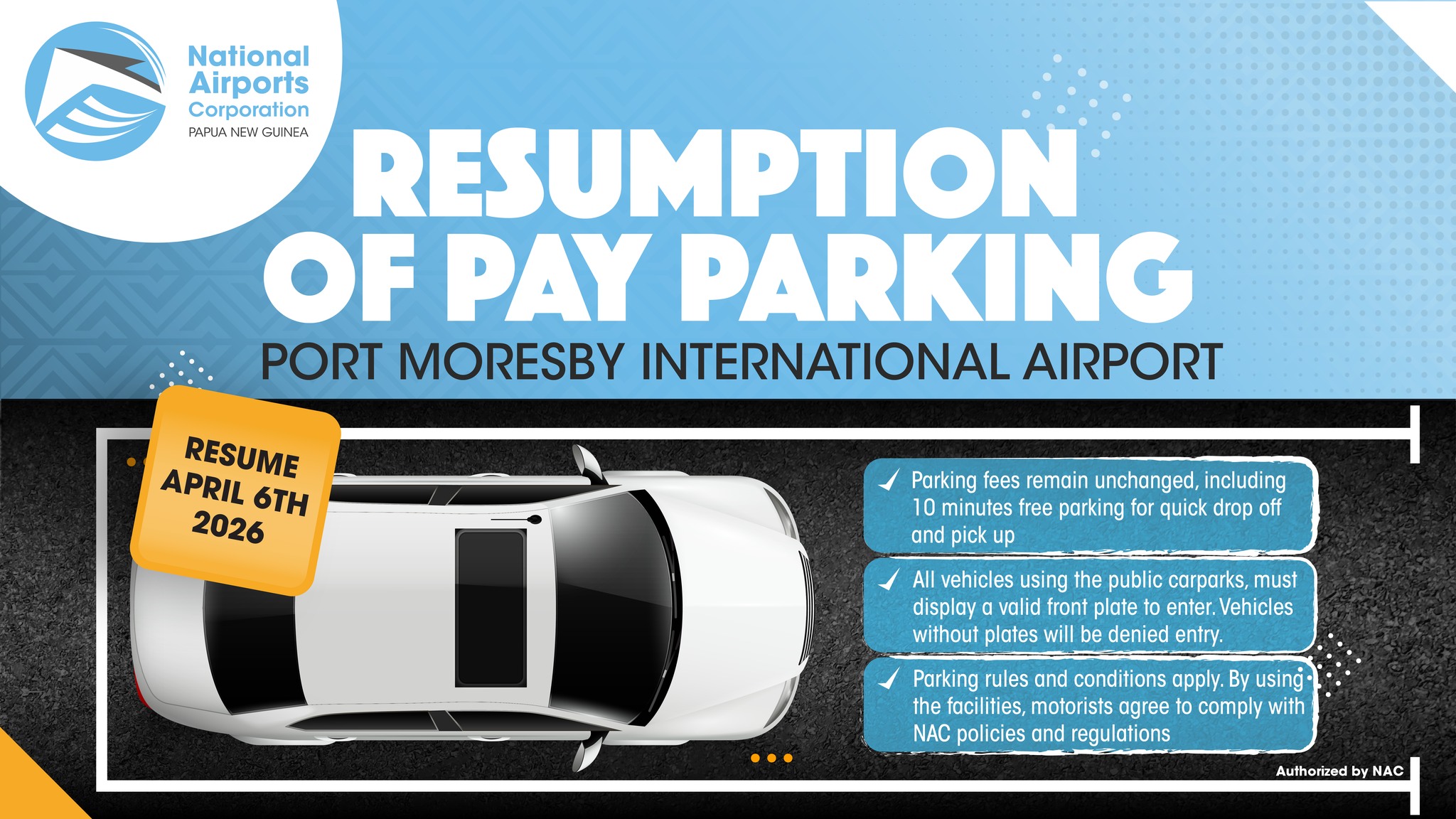 The National Airports Corporation (NAC) advises all airport users and the travelling public that Pay Parking will 𝗿𝗲𝘀𝘂𝗺𝗲 𝗼𝗻 𝟲𝘁𝗵 𝗔𝗽𝗿𝗶𝗹 𝟮𝟬𝟮𝟲 at the Port